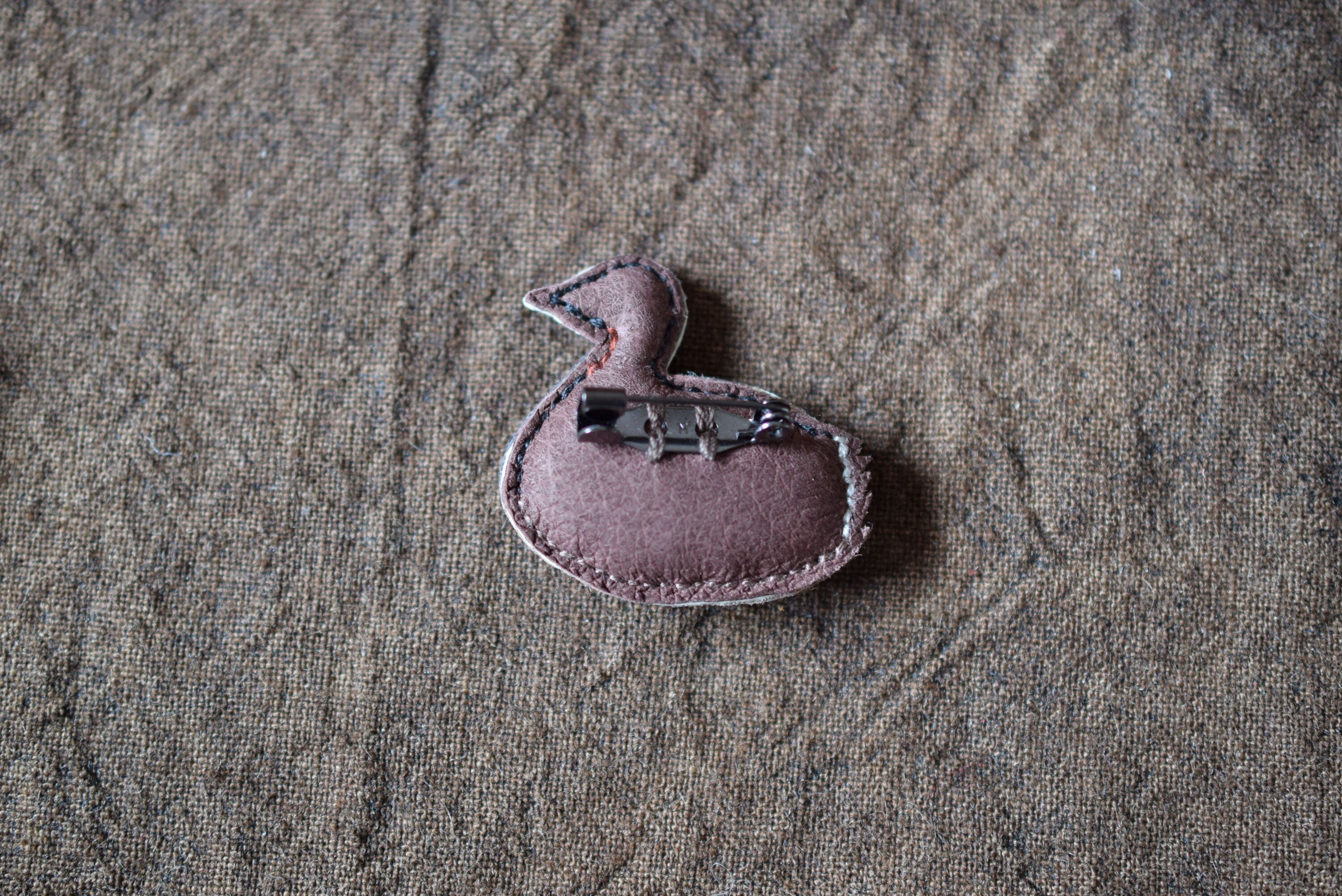 豚革に綿を詰めて周りをぐるりと手縫いした、カイツブリのブローチです。