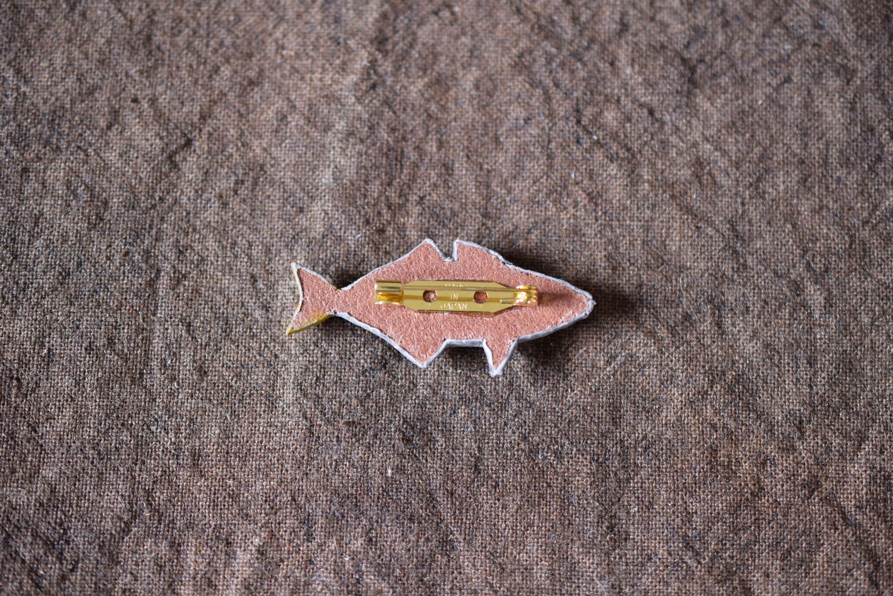 牛の床革を彫った上に豚革を貼って作ったアジのブローチです。