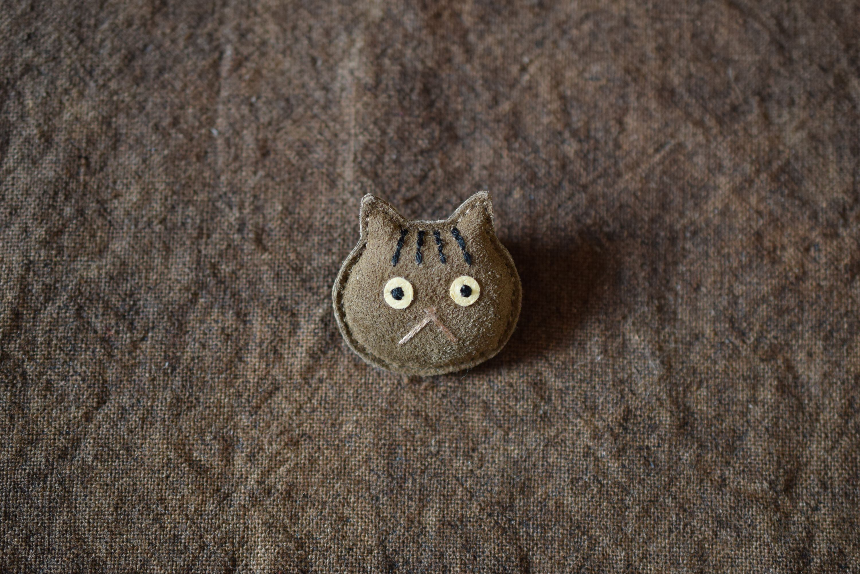 豚革に綿を詰めて周りをぐるりと手縫いした、猫のブローチです。