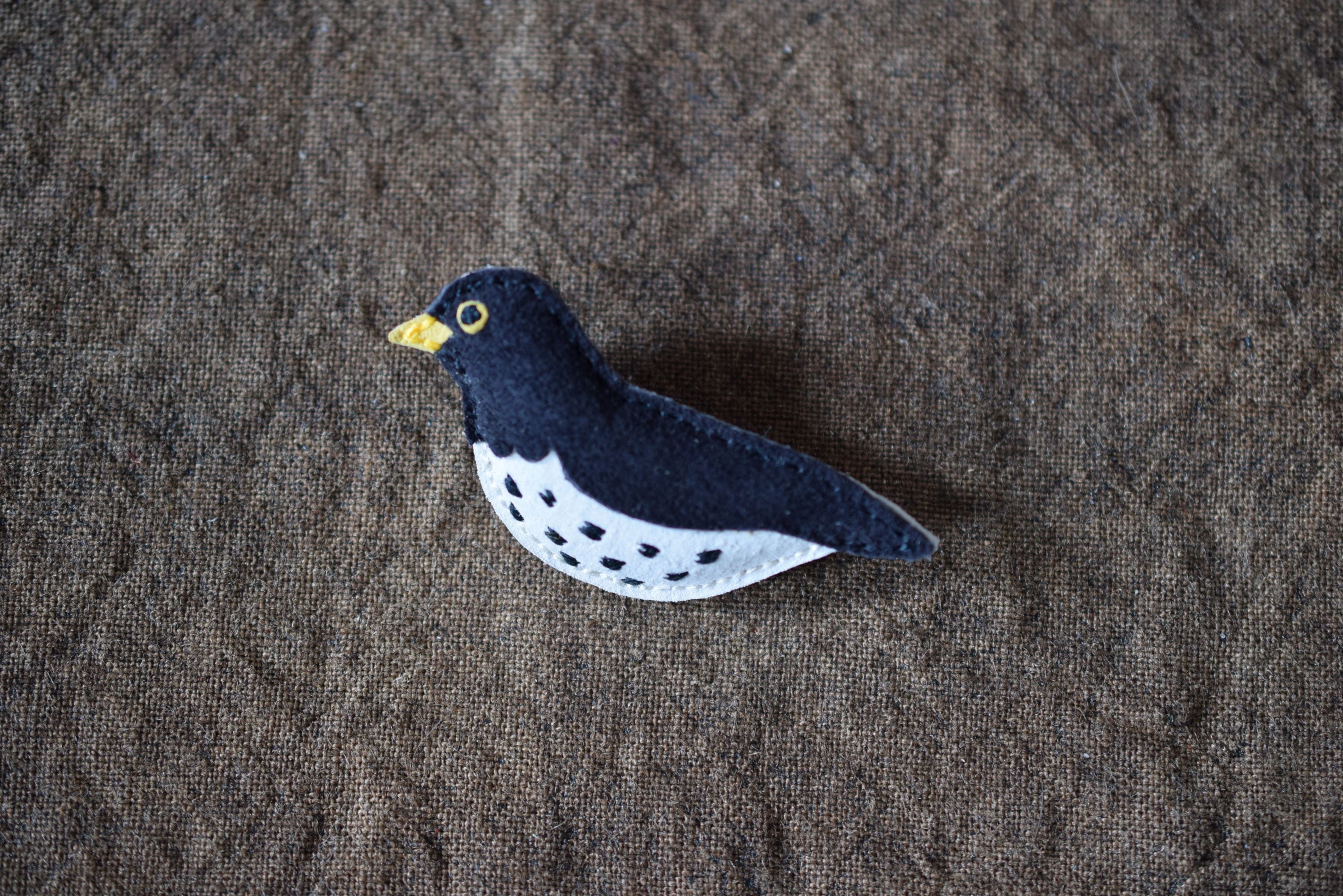 豚革に綿を詰めて周りをぐるりと手縫いした、クロツグミのブローチです。